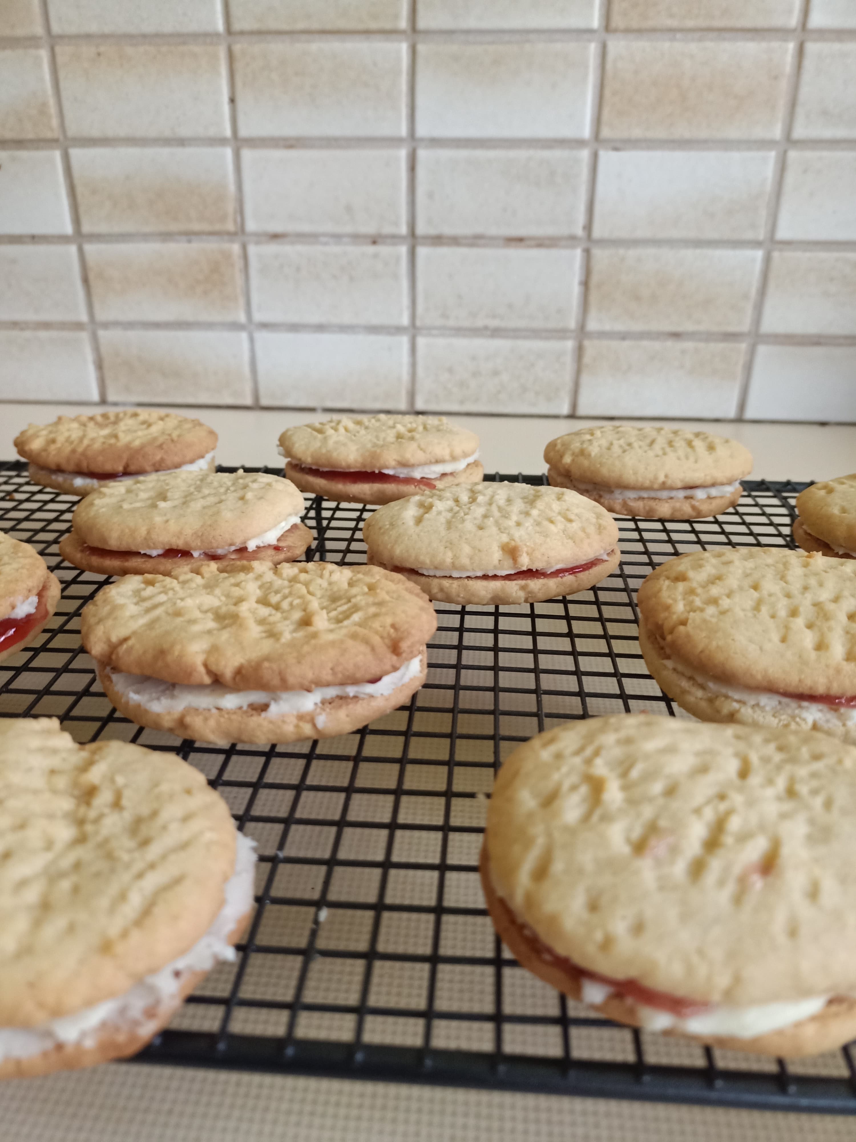 Smear icing and jam onto biscuits and sandwich them. Eat with a cup of tea.